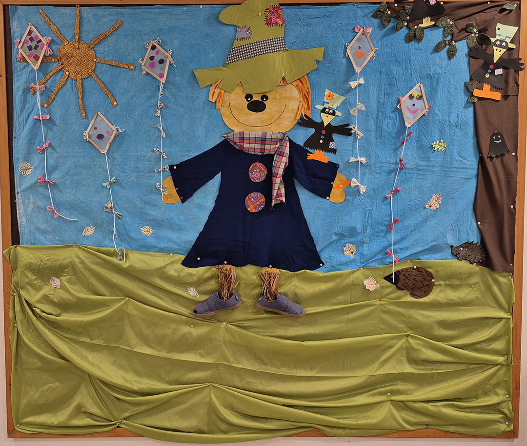 Die Kinder der Offenen Ganztagsschule haben eine Vogelscheuche als kreatives Wandbild gestaltet. Dank liegengebliebener Hausschuhe vom letzten Schuljahr bekommt sie auch keine kalten Füße.